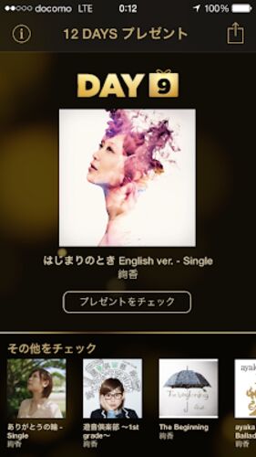 Appleの「12 DAYS プレゼント」アプリ、9日目は絢香のシングル「はじまりのとき English ver.」です。