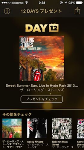 Apple「12 DAYS プレゼント」、最終日12日目は、今年2月に来日するザ・ローリング・ストーンズのライブ「Sweet Summer Sun, Live in Hyde Park 2013」です。