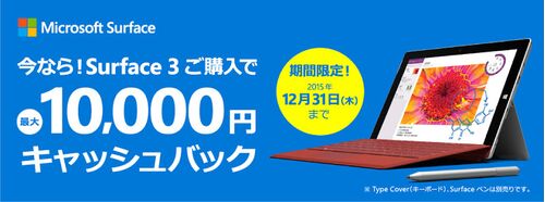日本マイクロソフトは、対象「Surface 3」を購入で最大10,000円をキャッシュバック(返金)する期間限定キャンペーンを本日から開催しています。キャンペーン期間は、2015年12月3日から2015年12月31日まで。Surface3 Wi-Fi 64GBモデルは5千円キャッシュバッ…