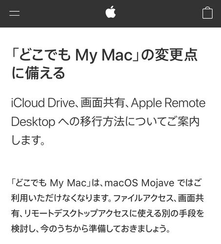 macOS 10.14 Mojaveでは、iCloudの機能の1つである「どこでも My Mac」機能が利用できなくなることをAppleが案内しています。 「どこでも My Mac」の変更点に備える - Apple サポート そのため、ファイルアクセス、画面共有、リモートデスクトップアクセスの…