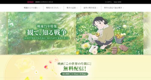 動画配信サービスGYAO![ギャオ]にて、映画『この世界の片隅に』などを期間限定で無料配信する「戦後75年特集 観て、知る戦争」が開催されています。映画『この世界の片隅に』は2016年に公開されました。監督は片渕須直氏。 『この世界の片隅に』は9月9日まで…