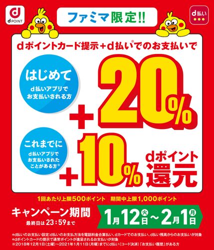 NTTドコモは、全国のファミリーマートでdポイントカードを提示し、d払い(コード決済)で支払うと通常のポイントに加えてdポイントを最大20%還元する「ファミリーマート限定!d払い最大+20%還元キャンペーン」を開催します。期間は1月21日から2月1日まで…