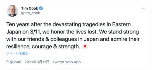 AppleのTim Cook CEOは、東日本大震災から10年となった11日、コメントを発表しています。東日本で起きた壊滅的な悲劇から10年が経ち、私たちは亡くなられた方々に敬意を表します。 私たちは日本の友人や仲間たちとともにあります。彼らの立ち直る力、勇気、…