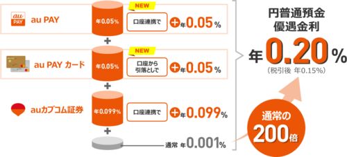 auじぶん銀行は9月1日から、au PAY、au PAYカード、auカブコム証券口座と連携した顧客を対象に円普通預金金利年0.2%(税引後年0.15%)を提供する「auまとめて金利優遇」を開始します。 また、au PAY 残高からauじぶん銀行に自動的に資金を移動する払出機能…
