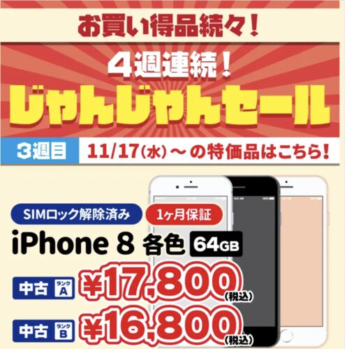 中古ショップじゃんぱらで「4週連続!じゃんじゃんセール」を開催しています。 3週目の目玉は、iPhone8 64GBが16,800円から、AirPods Pro (2019) MWP22J/Aが17,800円、Nintendo Switchが24,800円などとなっています。 4週連続!じゃんじゃんセール