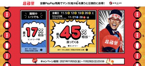 ebookjapanは、超PayPay祭の期間中、「電子書籍をPayPayで購入すると最大45%相当戻ってくる」キャンペーンを開催しています。期間中の金曜日とラスト2日間のグランドフィナーレ(11月27日・28日)は最大45%還元となっています。 ebookjapan:電子書籍をPay…