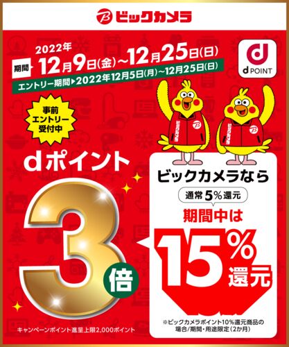 ドコモのdポイントにて12月9日より、ビックカメラでdポイントを提示して買い物すると通常5%が3倍の15%ポイント還元となる「ビックカメラでdポイント3倍」キャンペーンが開催されます。 期間は12月25日まで。 【dポイントクラブ】ビックカメラでdポイント3…