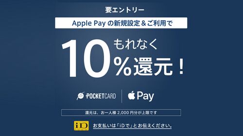 ポケットカードにて、Apple Payを新規設定&利用で10%を還元するキャンペーンが開催されています。 期間は5月7日まで。キャンペーン期間中にポケットカードをApple Payに新規設定し、Apple Payを利用すると、利用合計金額(税込)の10%をもれなく還元。 還…