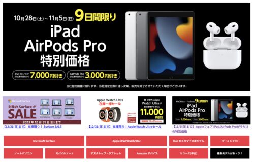 ヤマダデンキの公式通販サイトヤマダウェブコムにて、iPad第9世代とAirPods Pro第2世代が割引となる特別セールが開催されています。 期間は11/5(日)まで。 ヤマダウェブコム:iPadとAirPods Proが特別価格に