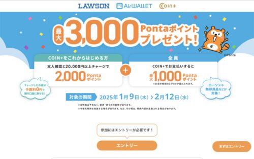 エアウォレットにて、新規および既存登録者を対象に最大3000ポイントが還元されるチャージ&決済キャンペーンが開催されています。 期間は2月12日まで。 【最大3,000Pontaポイント】エアウォレットチャージ&決済でプレゼント