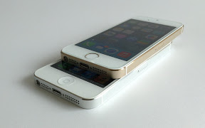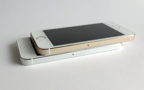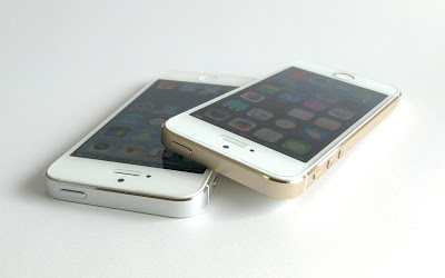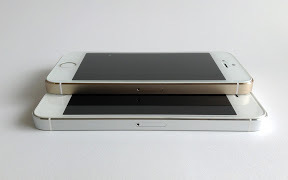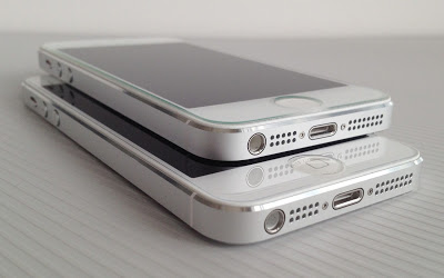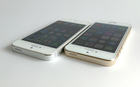 標準的なPET製フィルムを貼り付けたiPhone5(シルバー)を用意し、「GLAS.t スリム」を貼ったiPhone5s(ゴールド)と比べてみました。