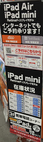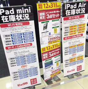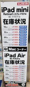 iPad mini Retinaディスプレイモデル、iPad Air(Wi-Fiモデル/Wi-Fi+Cellularモデル)の在庫状況について、新宿西口および東口の家電量販店を調査しました。