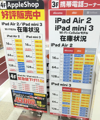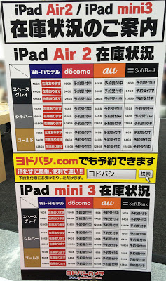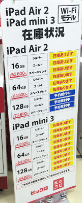全体的には、22日より販売の開始されたiPad Air2/iPad mini3 Wi-Fiモデルともに、一部モデルやキャリアを除き在庫は比較的あったと思います。