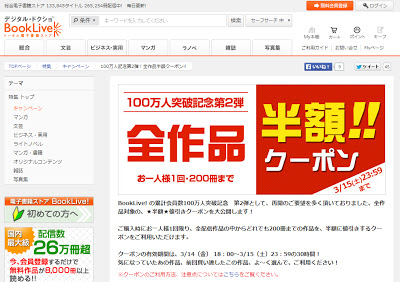電子書籍ストアBookLive!は、累計会員数100万人突破記念第2弾として、すべての作品が50%オフになる「30時間限定!全作品半額キャンペーン
