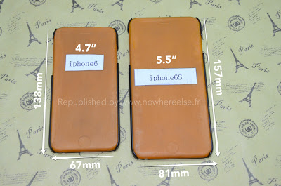 写真には2つのデバイスの寸法も示されており、5.5インチモデルは157×81mm、4.7インチモデルは138×67mmです。写真にはありませんが、厚みはiPhone5s(7.6mm)よりもさらに薄い7mmとなるようです。