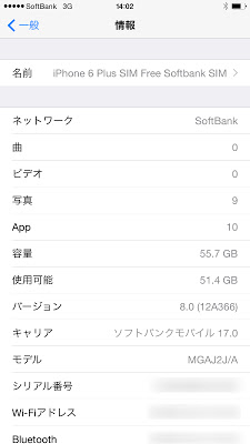 OSバージョンは「iOS 8.0」、容量は55.7GB、スクリーンショットを7枚撮った後で空き容量は51.4GBでした。