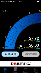 下り:27.7Mbps、上り:26.3Mbpsでした。