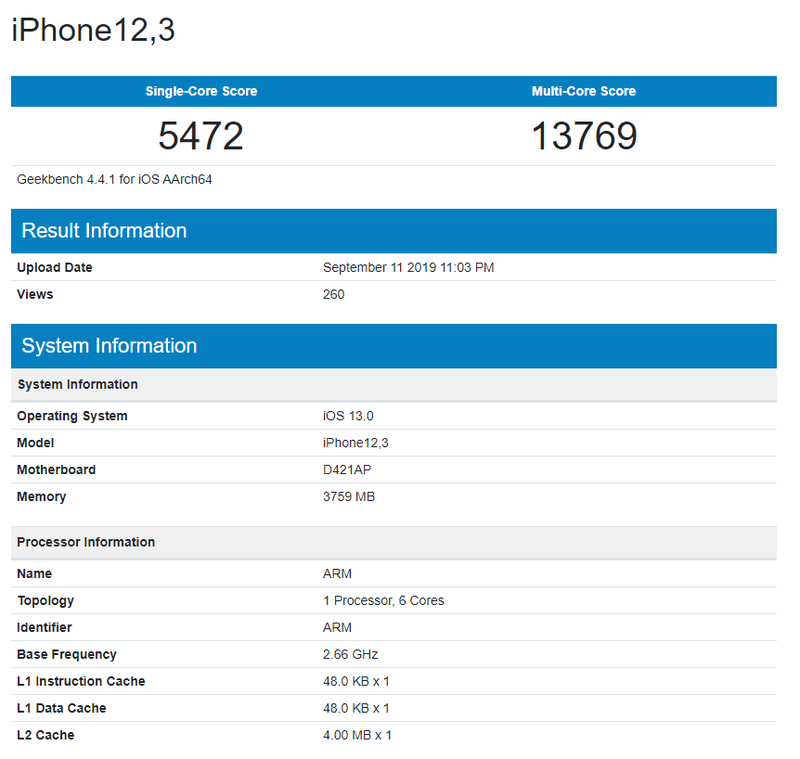 今回は「iPhone 11 Pro」であろう「iPhone12,3」のスコアで、Geekbench 4のシングルコアが「5472」、マルチコアが「13769」となっています。