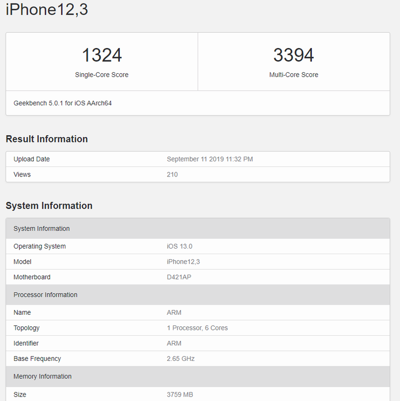 同様に、「iPhone12,3」のGeekbench 5スコアもアップされており、こちらはシングルコアが「1324」、マルチコアが「3394」となっています。