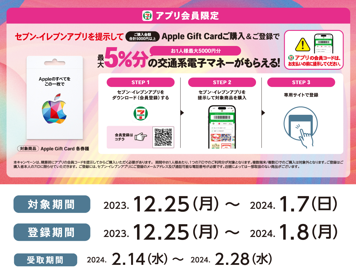 1月7日までのキャンペーン期間中、セブン‐イレブン各店舗のレジにて、セブン‐イレブンアプリを提示して合計5,000円以上Apple Gift Cardを購入・キャンペーン専用サイトから登録すると、合計購入金額の5%分(最大5,000円分)の「Suica」「PASMO」「ICOCA」などの交通系電子マネーがもらえます(PiTaPa(ピタパ)は対象外)。