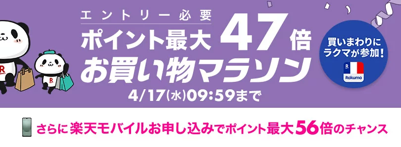 楽天市場にて17日(水)09時59分まで、ポイント最大47倍となる、お買い物マラソンが開催されています。