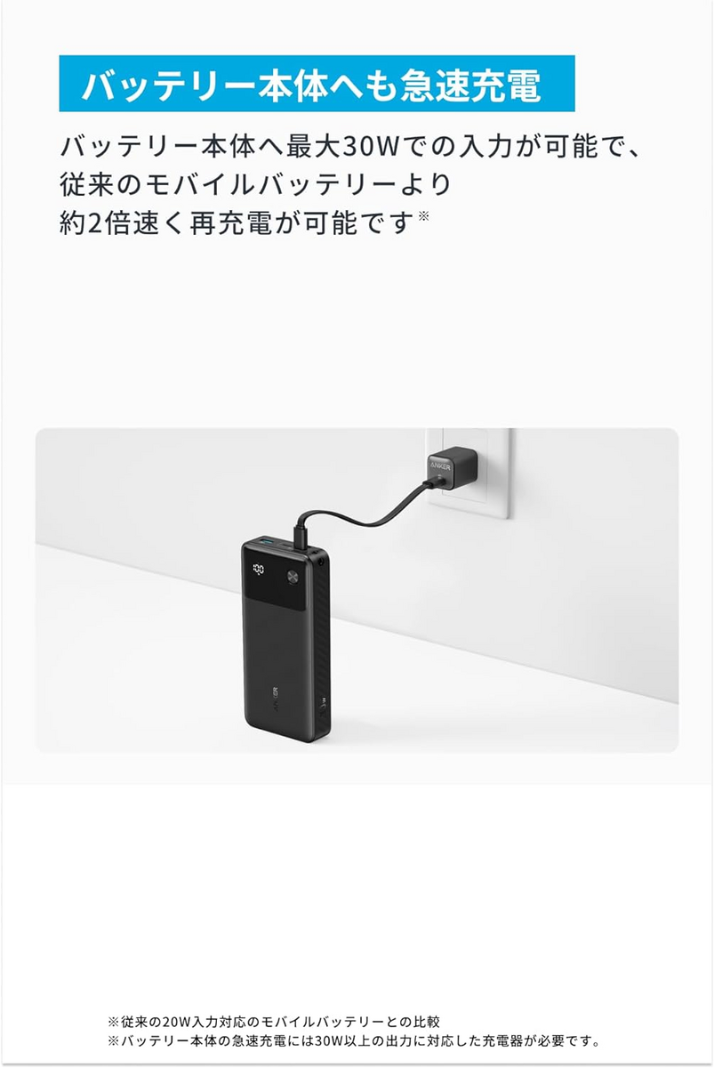 バッテリー本体へも急速充電:バッテリー本体へ最大30Wでの入力が可能で、従来のモバイルバッテリーより約2倍速く再充電が可能です。 (従来の20W入力対応のモバイルバッテリーとの比較)