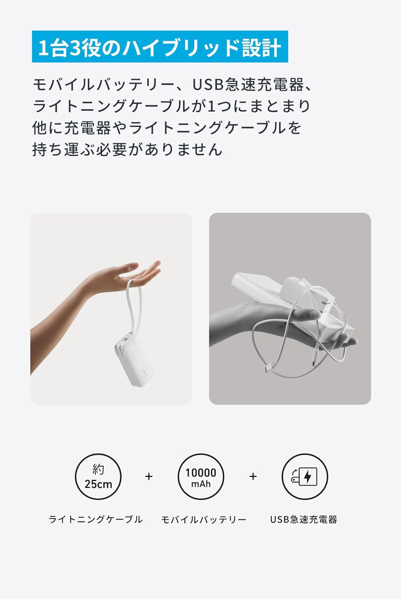 1台3役のハイブリッド設計:モバイルバッテリー、USB急速充電器、ライトニングケーブルが1つにまとまりました。他に充電器やライトニングケーブルを持ち運ぶ必要がありません。