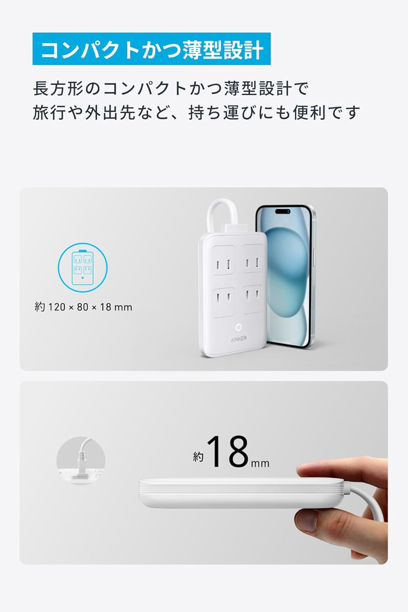 - 電源タップにはAnker独自の保護構造を採用しています。また本製品は、高負荷が続く場合に高温になる場合があるため、充電中は触れないようご注意ください。ご使用中に本製品が最高温度に達した場合でも、国際的な規格であるIEC 62368-1が定める上限温度を下回る設計となっております。