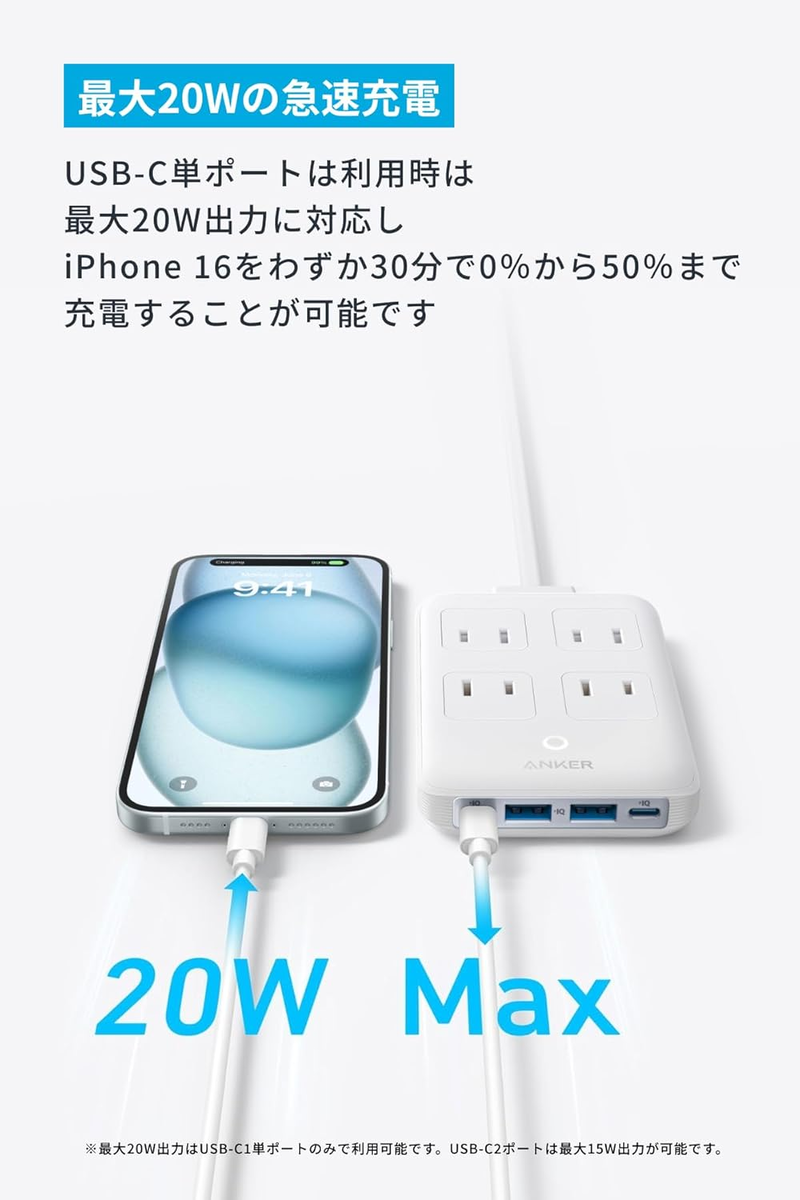 最大20Wの急速充電:USB-C 単ポートは最大20W出力に対応し、iPhone 16をわずか30分で0%から50%まで充電することが可能です (充電速度はAnker調べ) 。