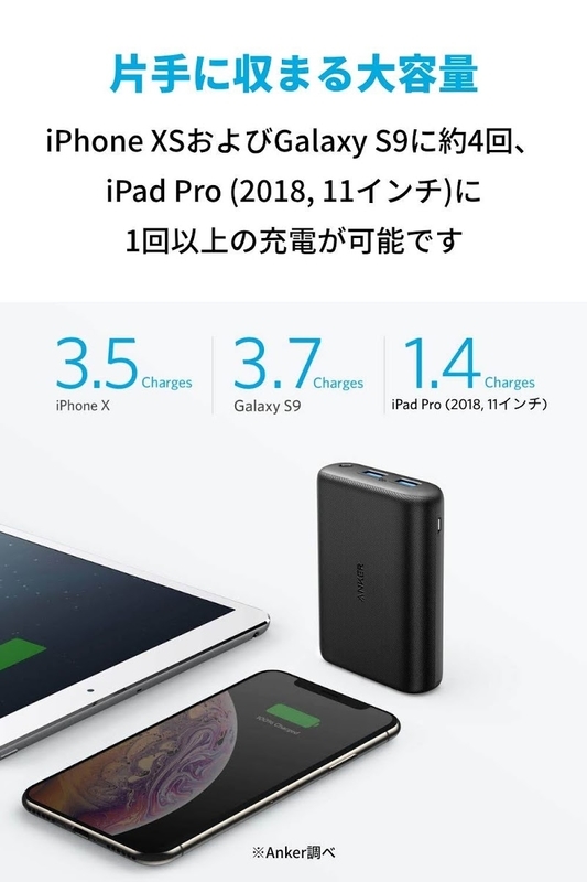 15,000mAhの大容量により、iPhone XSおよびGalaxy S9に約4回、iPad Pro (2018, 11インチ)に1回以上の充電が可能です。