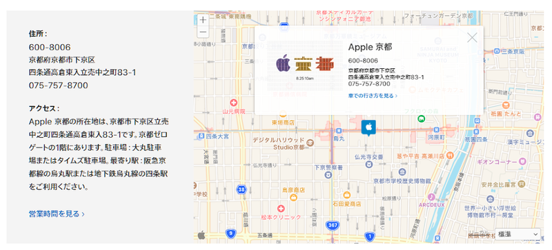 「Apple 京都」の住所は、京都府京都市下京区四条通高倉東入立売中之町83-1。京都ゼロゲートの1階です。