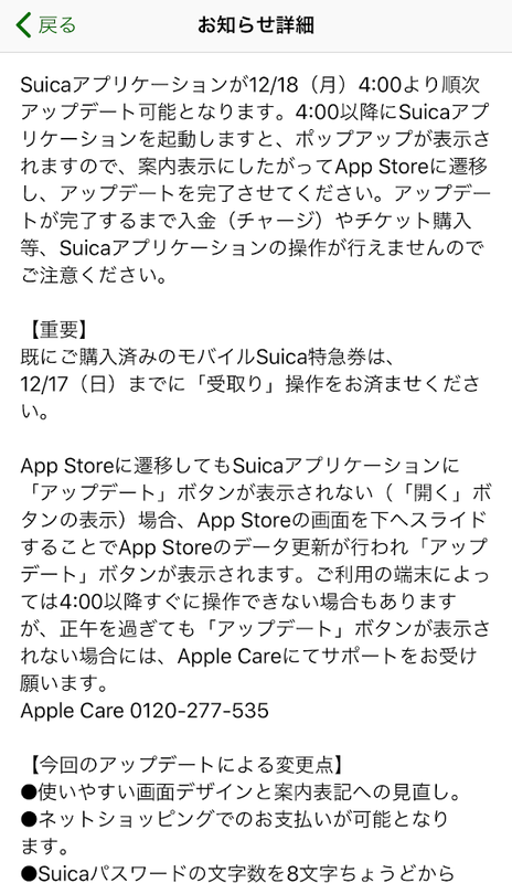 アップデートの方法は、12月8日4時以降にアプリを起動するとポップアップが表示されるので、その案内に従い行います。SuicaアプリからApp Storeに遷移後もSuicaアプリにアップデートボタンが表示されない場合はApp Storeのデータ更新(画面を下にスライドさせる)を行います。4時以降すぐに操作できない場合もありますが、正午過ぎでもアップデートできない場合はApple Care(0120-277-535)でサポートを受けるようにと指示しています。