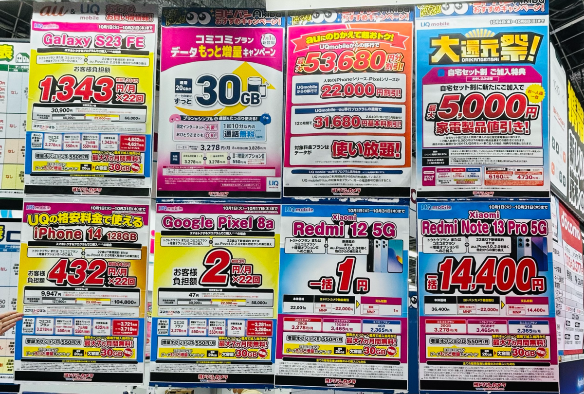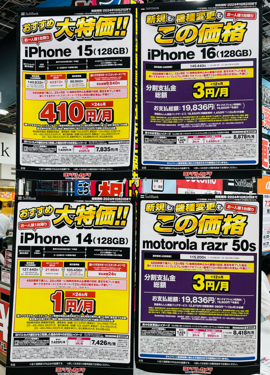 ソフトバンク、au、ドコモでは、新発売のiPhone 16に加えて、iPhone 15、iPhone 14、Google Pixel 8a、Pixel 9、Pixel 9 Pro、Xperia、Galaxyなど主要なスマートフォンの一括および分割販売が実施されていましたが、値下げされたiPhone 15に特に注目です。