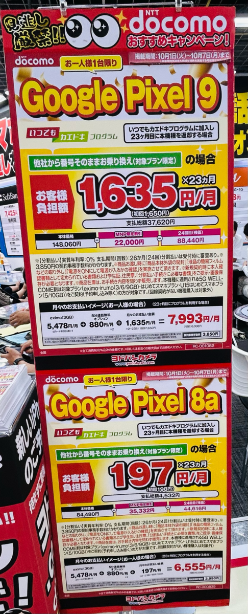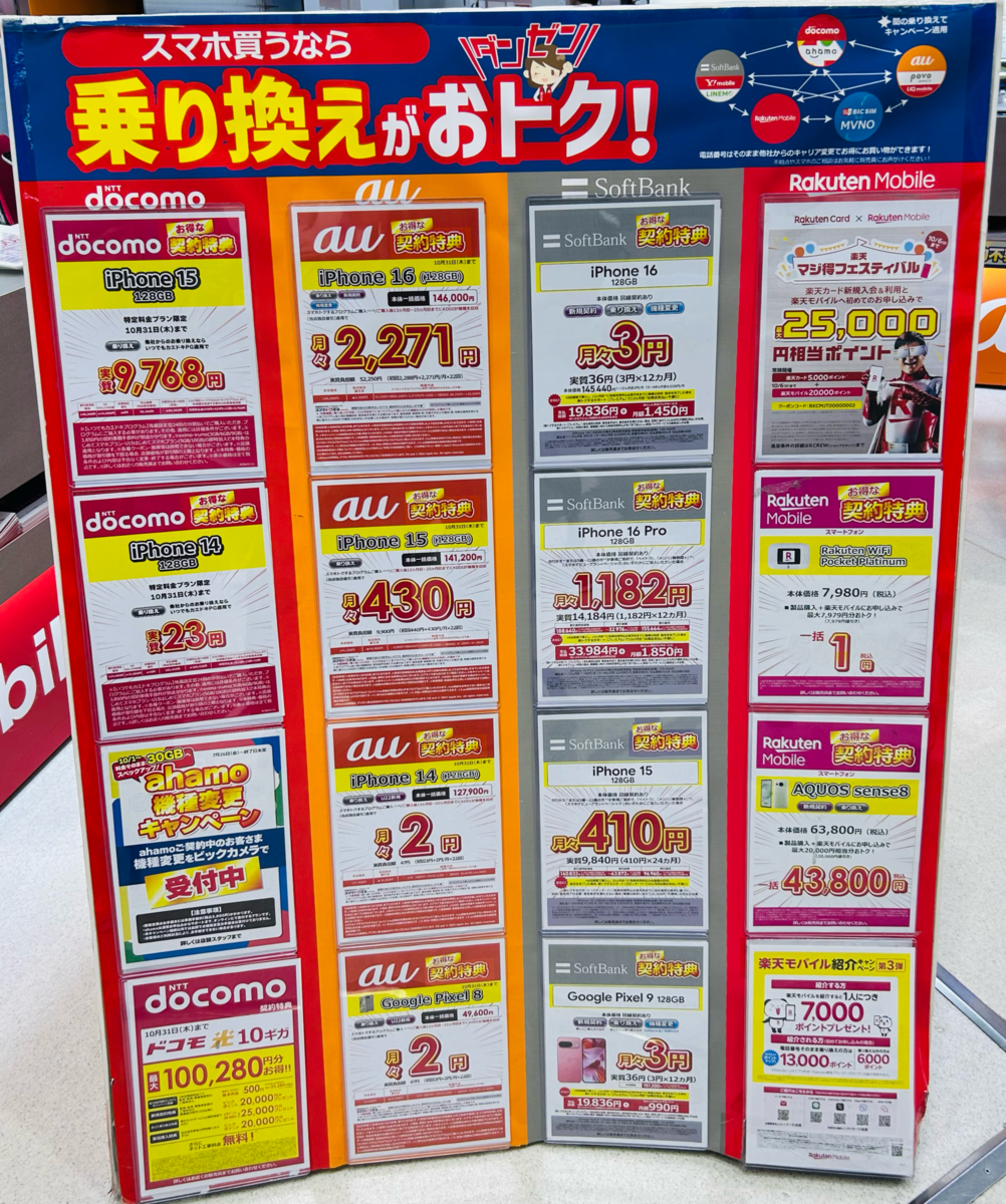 ドコモではいつでもカエドキプログラムで、auではスマホトクするプログラム、ソフトバンクでは新トクするサポートを適用することで、iPhone 14、iPhone 15、iPhone 16、Pixel 9、Pixel 8aなどが実質1円からとなっていました。