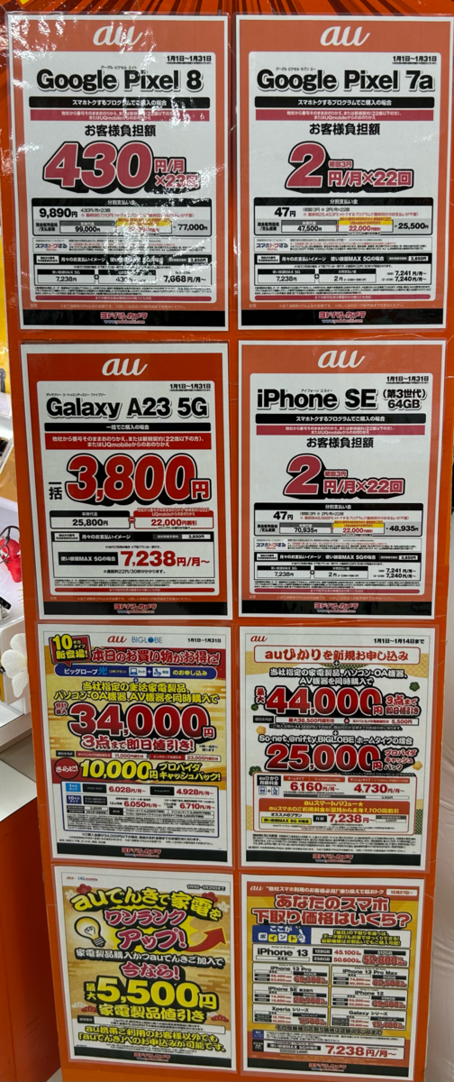 今週もiPhone 14、iPhone 13、iPhone SE3、Google Pixel 8、Pixel 8 Pro、Pixel 7a、Xperia、Galaxyなど主要なスマートフォンの一括および分割販売の状況を東京都内の家電量販店でチェックしてきました。