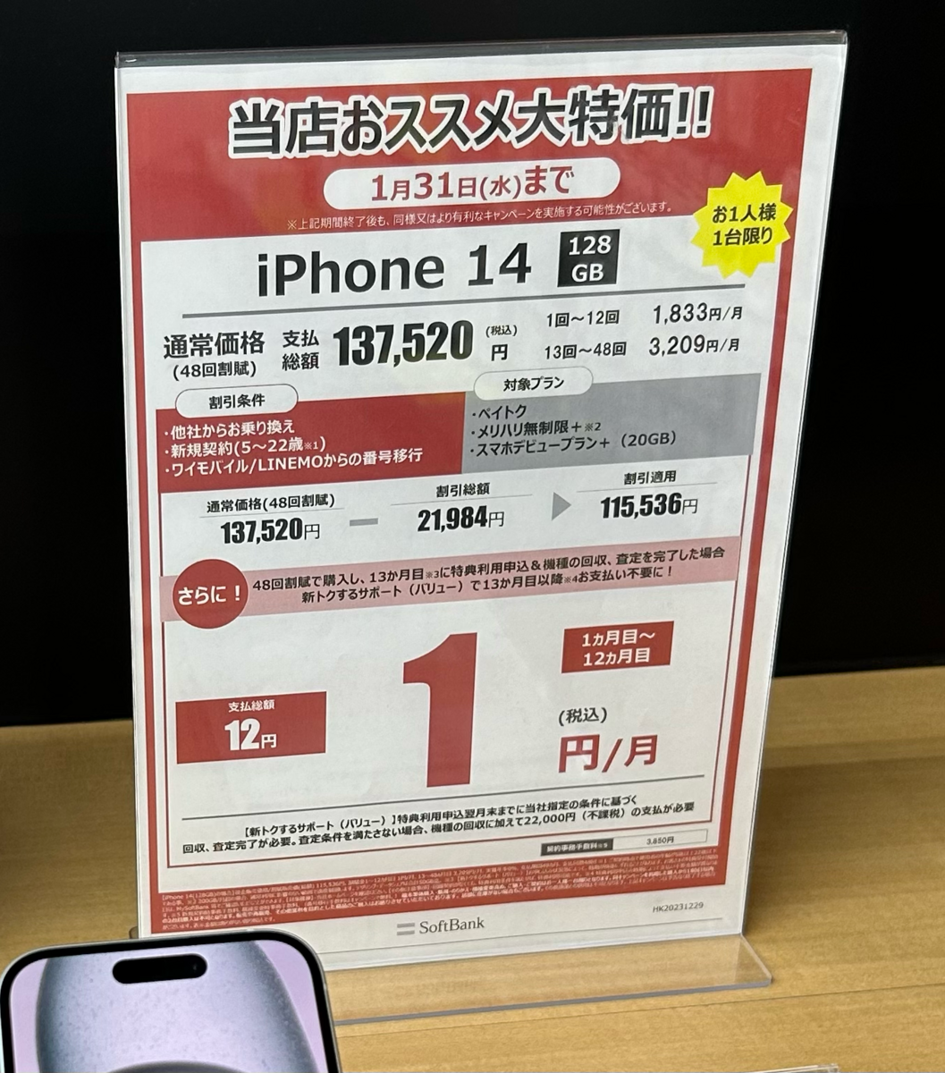 ソフトバンクでは、新トクするサポート(バリュー)により、iPhone14が実質1円となっていました。
