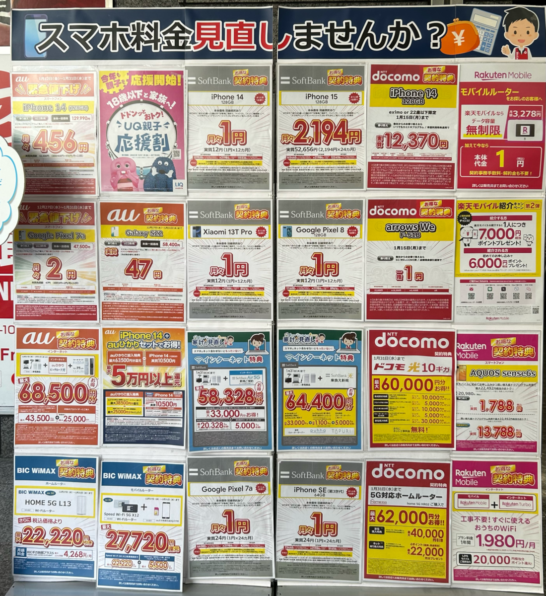 ソフトバンク、au、ドコモの、iPhone 14、iPhone 13、iPhone SE3、Google Pixel 8、Pixel 8 Pro、Pixel 7a、Xperia、Galaxyなど主要なスマートフォンの一括および分割販売が実施されていました。
