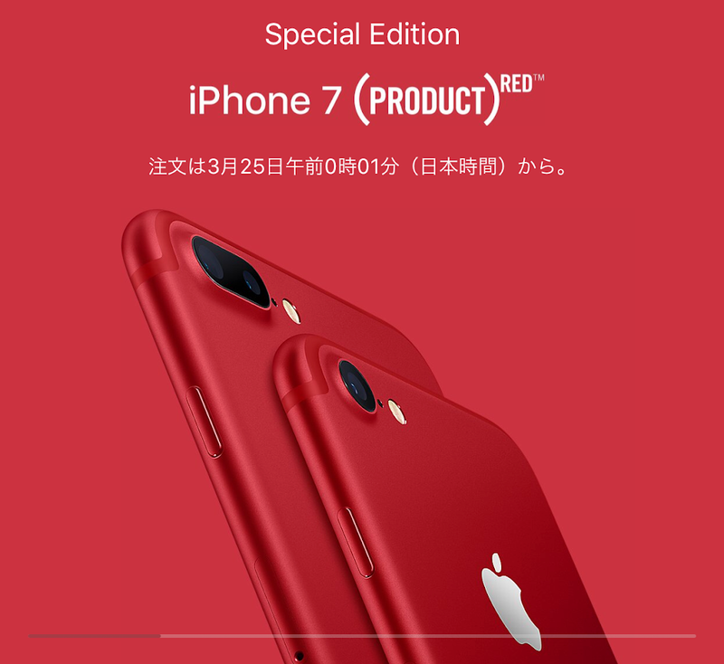 2017-03-21 Apple、 iPhone7にスペシャルエディション (PRODUCT)REDを追加 iPhone 7 Share on Tumblr AppleはiPhone7/7 Plusに新色レッドモデル「 (PRODUCT)RED Special Edition」を追加しました。 注文は3月25日午前0時01分(日本時間)からです。Apple公式サイトで購入 Apple公式サイト iPhone